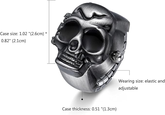 - UNIQUE DESIGN — A perfect combination of finger ring and watch, of practical use and decoration. Elastic strap, easy to put on or take off, and suitable for all size finger. Cool Punk skull cover design. This funky finger watch is designed to stand the test of time. Fashion accessory for your daily dressing match.